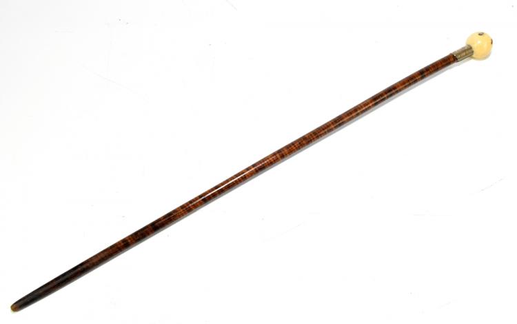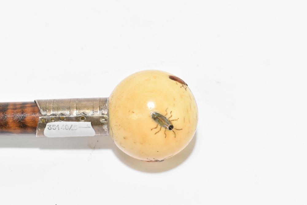 Lot 1403 of 2475: A Japanese Meiji period walking cane with ivory terminal decorated with Shibayama stylised insects, with white metal collar and stained wooden shaft, length 87cm.
