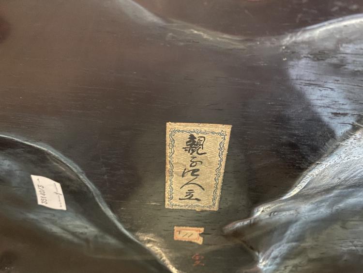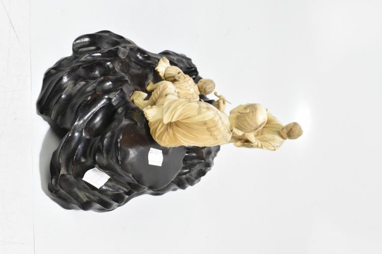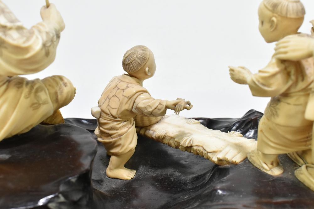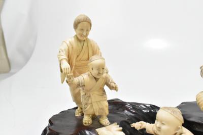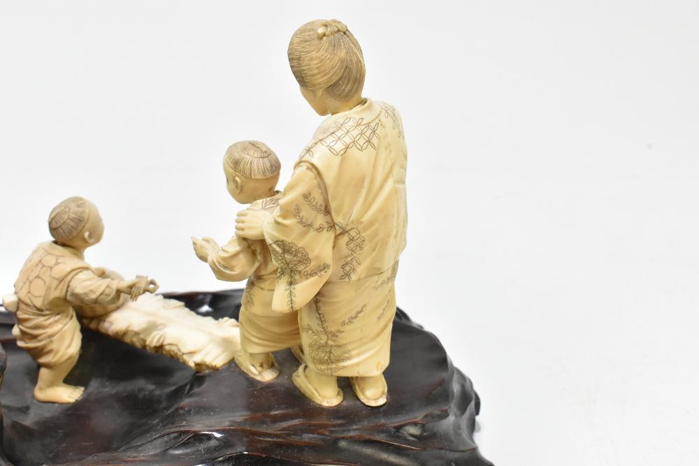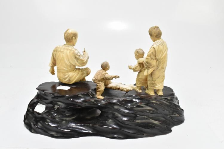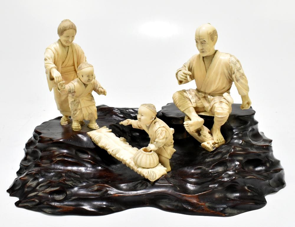 Lot 1404 of 2475: A large Japanese Meiji period ivory group depicting a family of four, raised on carved wooden naturalistic plinth base, bears applied label with signature to the underside, height 18cm, length 31cm.