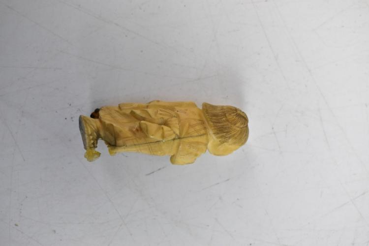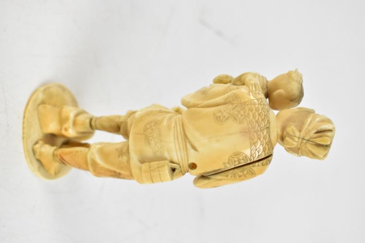 Lot 1406 of 2475: Two Japanese Meiji period carved ivory okimonos, the first depicting a gentleman holding flowers and boy, two character signature to base underside, height 17cm, and a further figure group of Samurai and young boy (both af) (2).