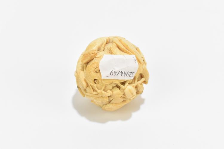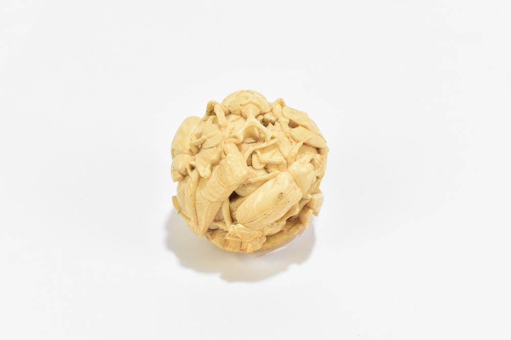 Lot 1407 of 2475: A Japanese carved ivory Meiji period okimono ball decorated with crickets, beetles and other insects, unsigned, diameter 5cm.
