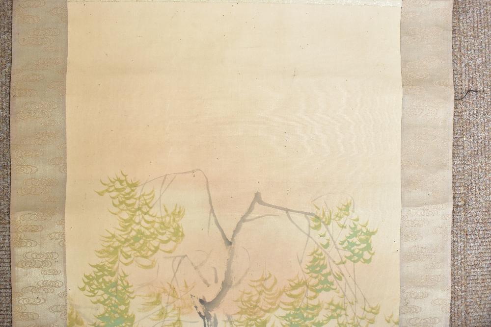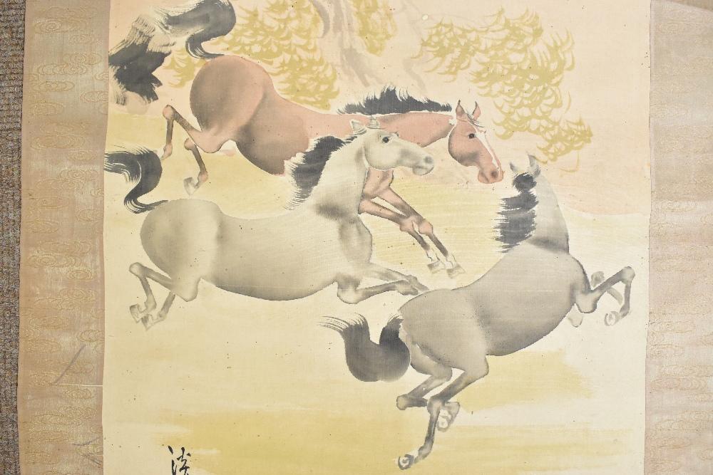 Lot 1411 of 2475: A late 19th/early 20th century Japanese wall hanging decorated with three prancing horses in landscape scene, seal mark lower left, with bone collar, overall length 182cm approx.