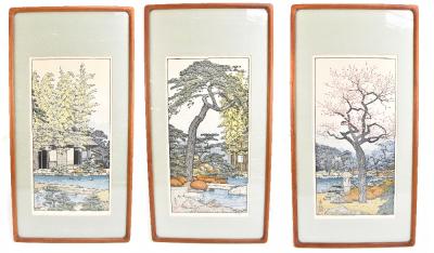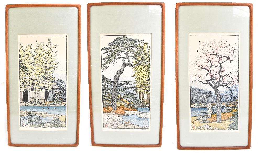 Lot 1412 of 2475: TOSHI YOSHIDA (1911-1991); ‘Plum Tree of the Friendly Garden’, ‘Bamboo’ and ‘Pine Tree of the Friendly Garden’, three pencil signed woodblock prints, bearing labels verso, 52 x 26.5cm (3).
