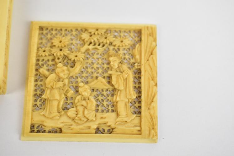 Lot 1577 of 2475: A Chinese Canton ivory puzzle game of square form, the case with sliding cover carved with figures in landscape, width 5cm, together with two instruction pamphlets relating to the puzzle game.