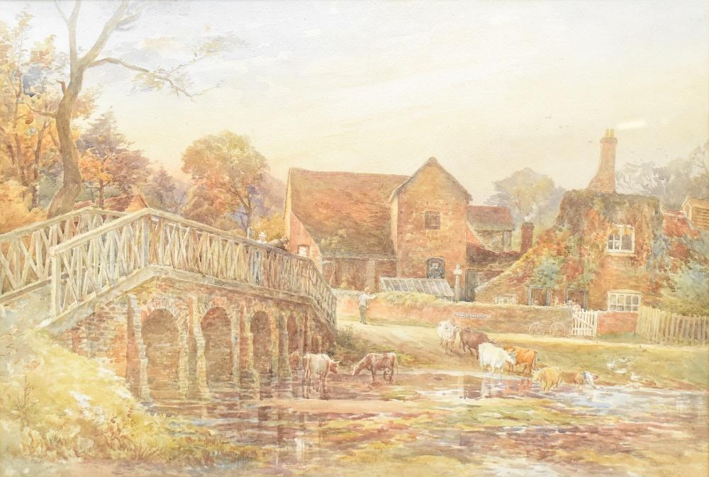 Lot 2043 of 2475: JAMES BILLINGSLEY (British, active late 19th/early 20th century); watercolour, ‘Sarehole Mill’, rural study with cattle watering beside bridge and before cottage, signed and dated 1922 lower right, 35 x 50.5cm, framed and glazed. Purchased from Graves Gallery 1970; Sarehole Mill was a haunt of the young J.R.R. Tolkien when growing up in the Birmingham area.