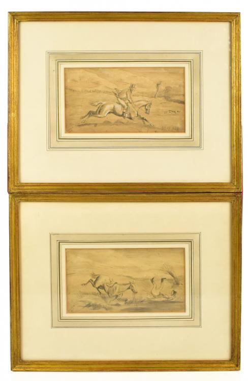 Lot 2057 of 2475: HENRY THOMAS ALKEN (1785-1851); a pair of pencil and watercolour drawings, humorous hunting scenes, signed lower left, 10.5 x 19cm, framed and glazed.