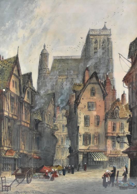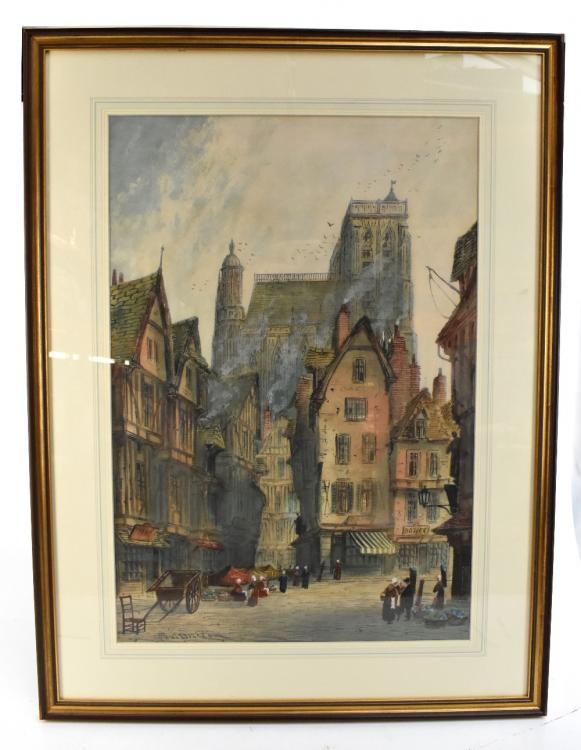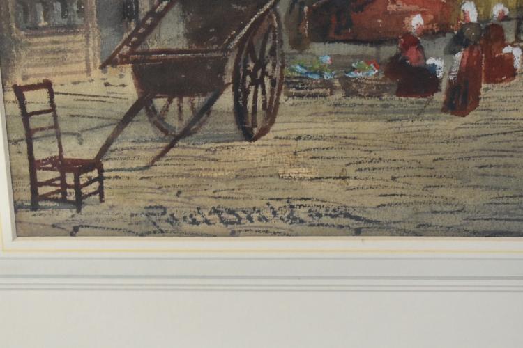Lot 2083 of 2475: PAUL BRADDON (1864-1938); large watercolour, Continental townscape with figures beside market stalls in the foreground, signed, 76 x 52cm, framed and glazed.