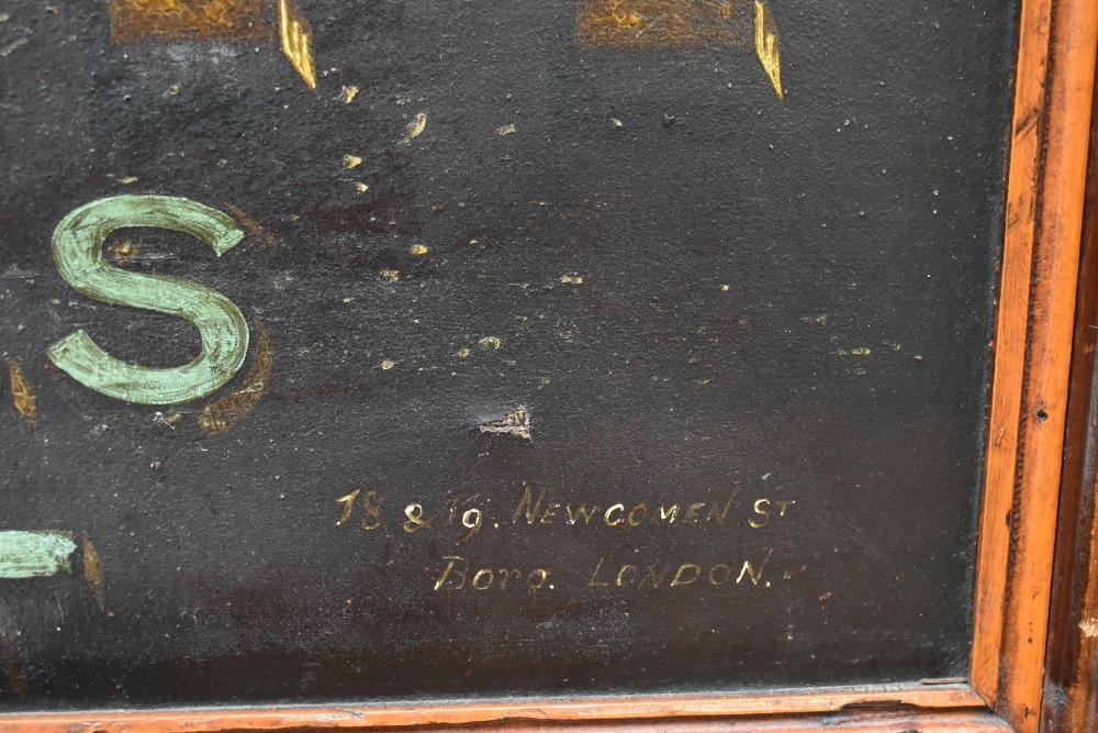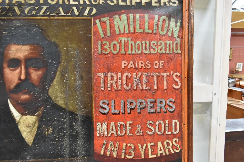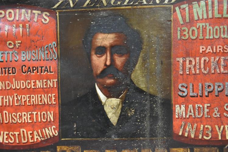 Lot 2088 of 2475: LATE 19TH CENTURY ENGLISH SCHOOL; oil on canvas, an unusual advertising portrait canvas for H. W. Trickett, Gaghill's Mills, Waterfoot centred with a portrait of Trickett with various text detailing the slipper manufacturers, signed lower left Syntax and inscribed lower right '18 & 19 Newcommon, Boro. London', 100 x 117cm. Footnote: This rare canvas has resided within the Trickett factory since it was created in the late 19th century, along with the other two rare works in this sale, they are