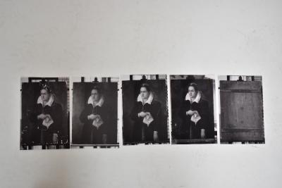 Lot 2089 of 2475: EARLY 17TH CENTURY SPANISH SCHOOL WITH POSSIBLE ATTRIBUTION TO SOFONISBA ANGUISCIOLA; a large oil on board, portrait of a lady in black dress with white lace collar and cuffs, a white veil over her head and holding a handkerchief in her right hand, unsigned, 98 x 68cm. This lot is accompanied by various correspondences from the previous vendor and the National Portrait Gallery (August 1961), various other correspondences including E & J Tawil, City of Manchester Art Galleries, etc, also informat