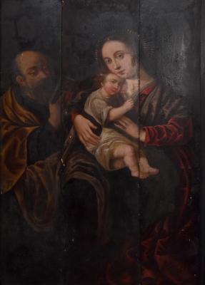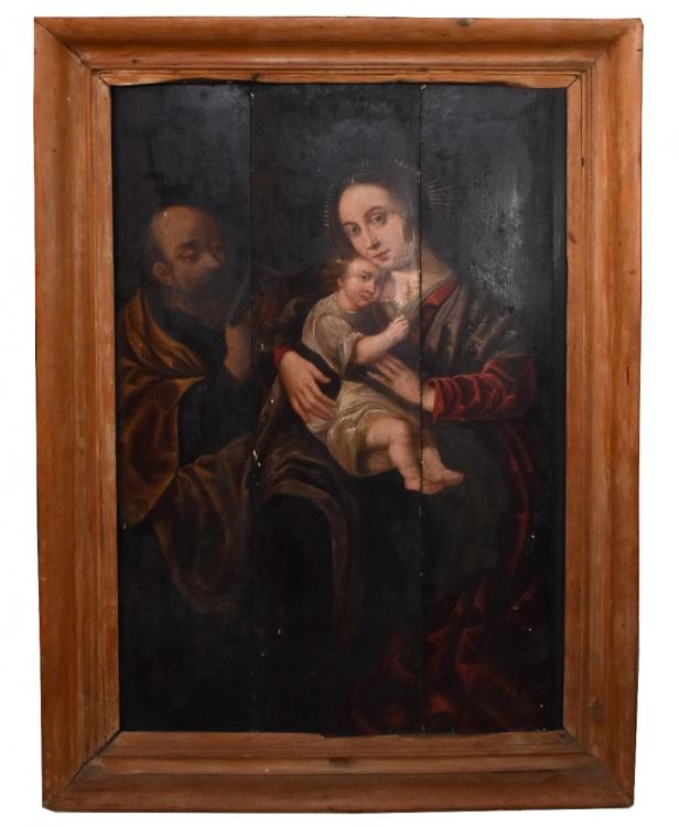 Lot 2094 of 2475: 19TH CENTURY SCHOOL; oil on three panels, 'Holy Family with St John the Baptist', unsigned, 106 x 72.5cm, framed.