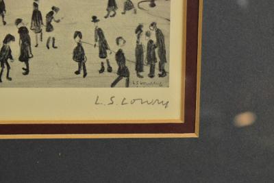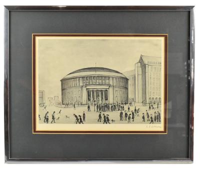 Lot 2134 of 2475: LAURENCE STEPHEN LOWRY RBA RA (1887-1976); a pencil signed limited edition print, 'Manchester Reference Library', with FATG blind stamp and letter to number code ADF for number 36, 24 x 34.5cm, framed and glazed. (D) Provenance: Purchased from the Alexander Gallery 20th February 1973 and has been with the vendor ever since.