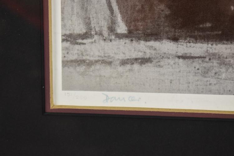 Lot 2139 of 2475: HAROLD RILEY DL DLitt FRCS DFA ATC (born 1934); a signed hand embellished limited edition coloured print, 'Dancer', signed and dated 81 and numbered 151 of 250, 31 x 41cm, framed and glazed. (D) Provenance: private collection London purchased Tony Warren estate.