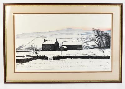 Lot 2146 of 2475: PETER BROOK (1927-2009); a limited edition signed coloured print, 'Waving Good-Bye', Lancashire snow scape, numbered 270/500, the image 34 x 57cm, framed and glazed. (D)