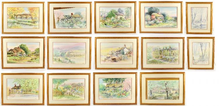 Lot 2393 of 2475: JOHN HASSALL; a set of twelve watercolours, rural landscapes, each signed, 36 x 54cm, framed and glazed and two further smaller studies by the same hand (14). (D)