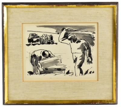 Lot 2394 of 2475: ATTRIBUTED TO JOSEF HERMAN OBE RA (1911-2000); ink wash, study of two labourers, unsigned, image 19.5 x 25cm, framed and glazed. (D)
