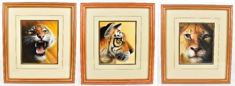 Lot 2400 of 2475: DAVID A FINNEY; three watercolours from the 'African Head Series' comprising lion, tiger (x2), each signed, 20.5 x 17cm, each framed and glazed. (D)