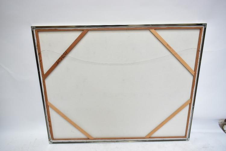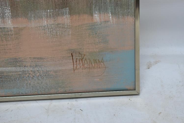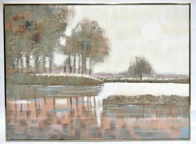 Lot 2516 of 2475: LEE ***; a large oil on canvas, stylised lake scene, signed Lee with indistinct surname lower right 120 x 150.5cm, framed.