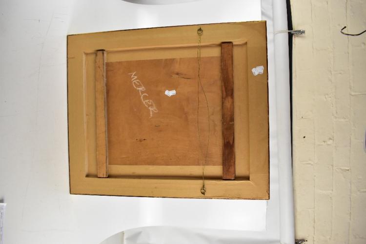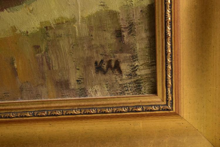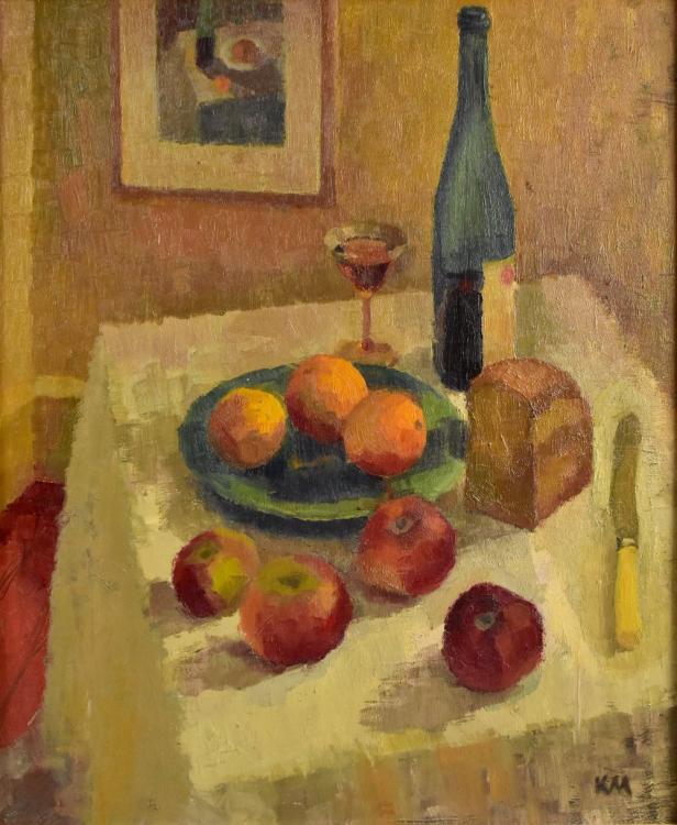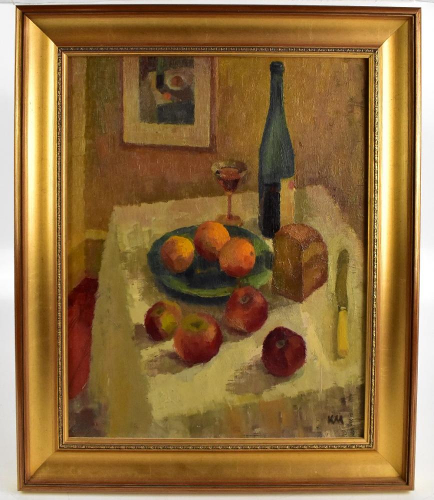 Lot 2518 of 2475: KM; oil on board, still life study with wine, bread and fruit, signed with initials, 60 x 47cm, framed.