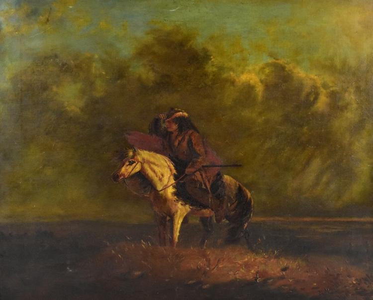 Lot 2527 of 2475: E MORTIMER; oil on canvas, American landscape with figure upon horse in foreground, signed, 50 x 60cm, framed. (D)