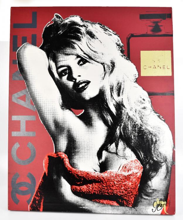 Lot 2534 of 2475: DEVIN MILES; mixed media on canvas, 'Brigitte Bardot - Chanel', signed with initials recto and verso, 101.5 x 80.5cm, unframed. (D)
