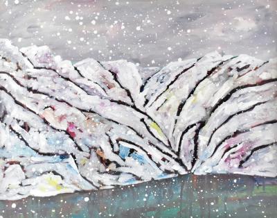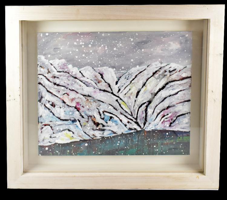 Lot 2537 of 2475: SIMON KEENLEYSIDE; oil on canvas, stylised snowy mountain lake landscape, unsigned, 50 x 60cm, mounted within recess, framed and glazed. (D)