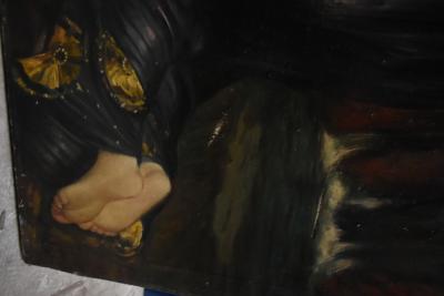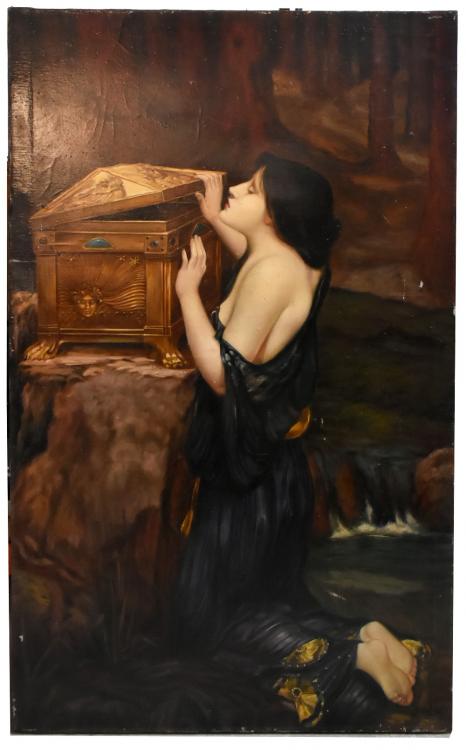 Lot 2538 of 2475: AFTER JOHN WILLIAM WATERHOUSE; a modern oil on canvas, 'Pandora', spurious initials lower right,120.5 x 69.5cm.