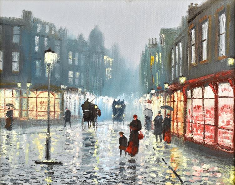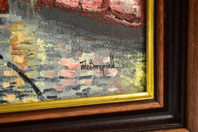 Lot 2575 of 2475: JOHN BAMPFIELD (born 1947); oil on canvas, street scene with figures beneath a street lamp, signed, 40 x 50cm, framed. (D)