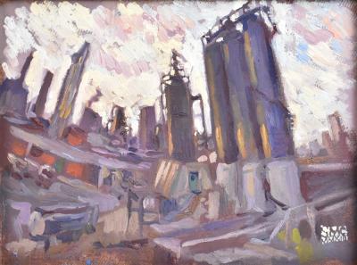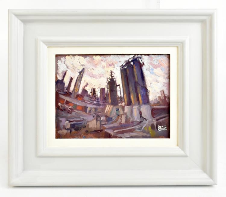Lot 2598 of 2475: STEPHEN CAMPBELL (born 1985); oil on board, 'Cargill Factory', signed lower right, 15 x 20cm, framed. (D)
