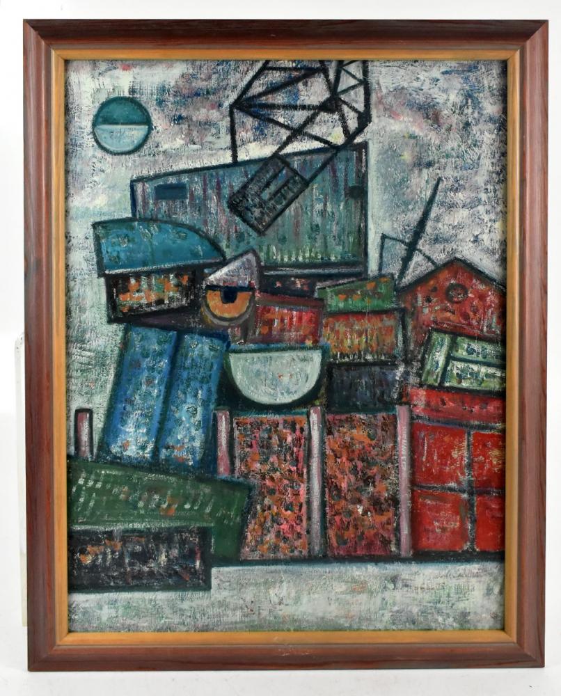 Lot 2601 of 2475: JOHN CHRISTOPHERSON (1921-1996); oil on board 'Scrapyard Crane', signed, titled, dated 1964 and numbered 255 verso, 60 x 45cm, framed. (D) Provenance: Private collection in Devon.