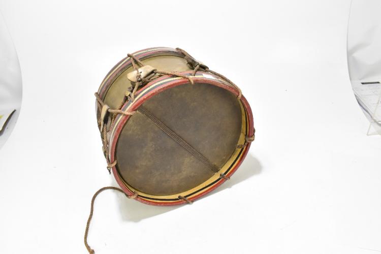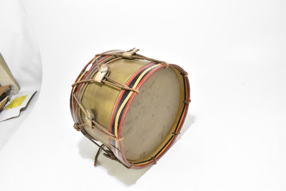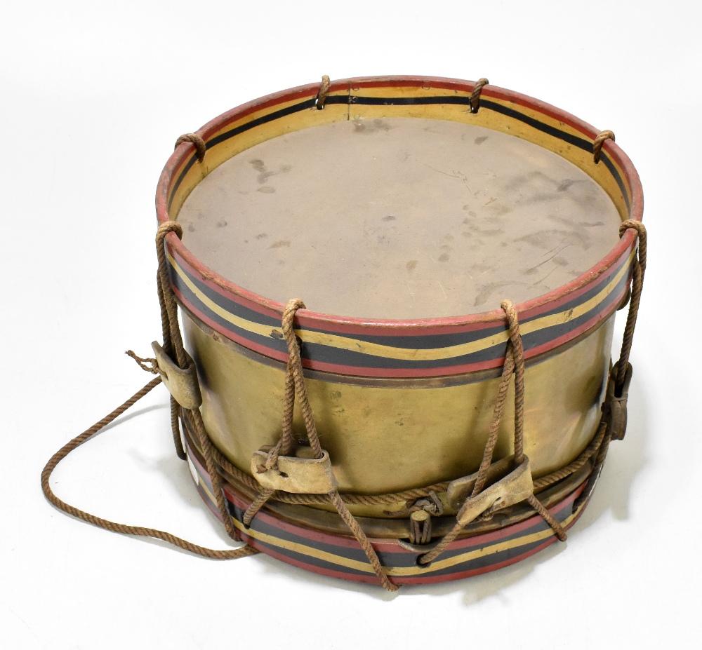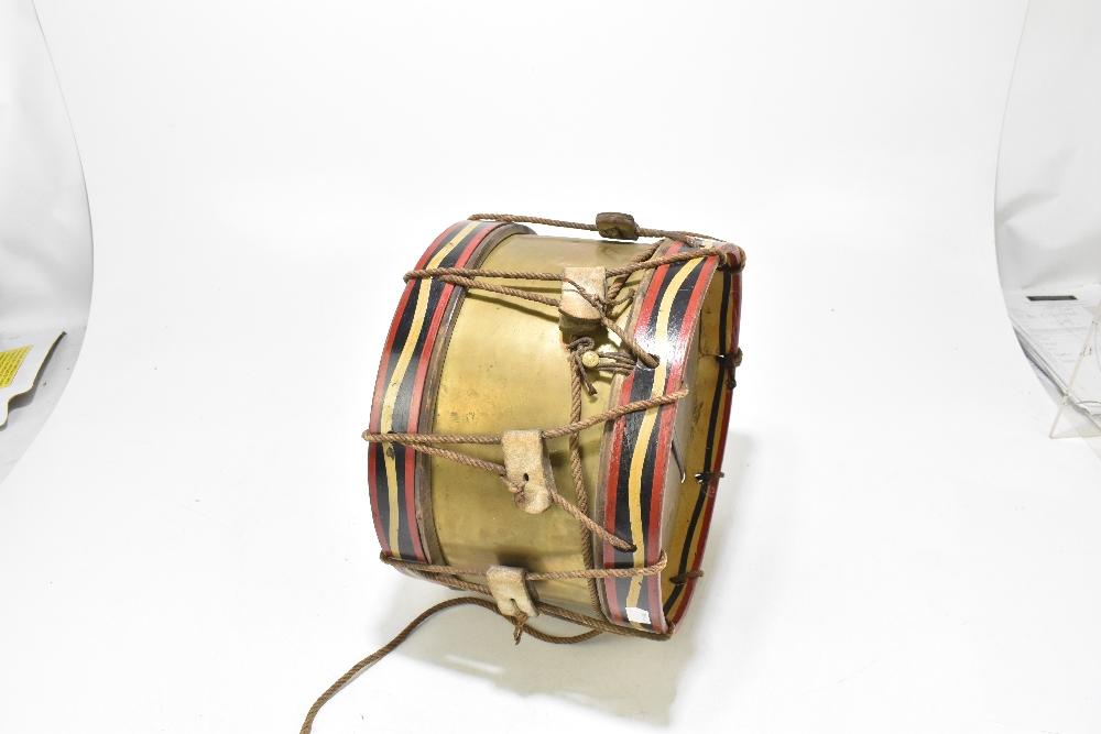Lot 416C of 2475: A brass and wooden bound snare drum 30 x 30 x 20cm.