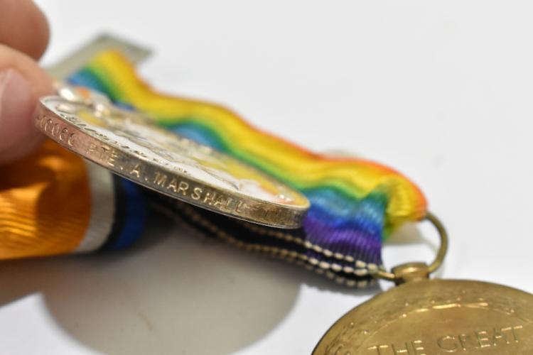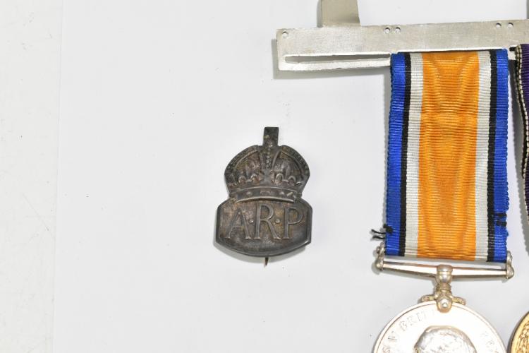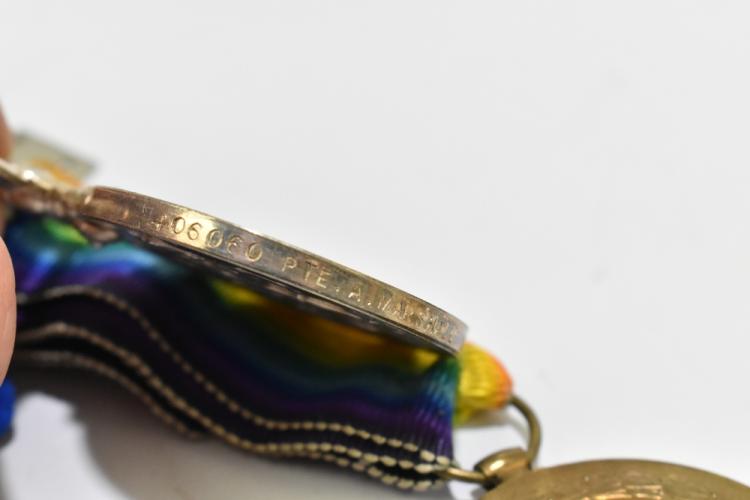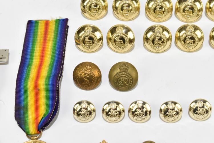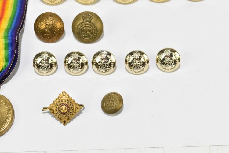 Lot 3 of 1434: A WWI War and Victory duo awarded to 406060 Private A. Marshall Liverpool Regiment (replacement issues), with single original Victory medal for Private Marshall, also a small group of buttons, an Air Raid Precautions badge and a hallmarked silver star badge with enamelled cross and inscribed 'In Hoc Signo Vinces'. Provenance: The Captain Allan Marshall Collection.