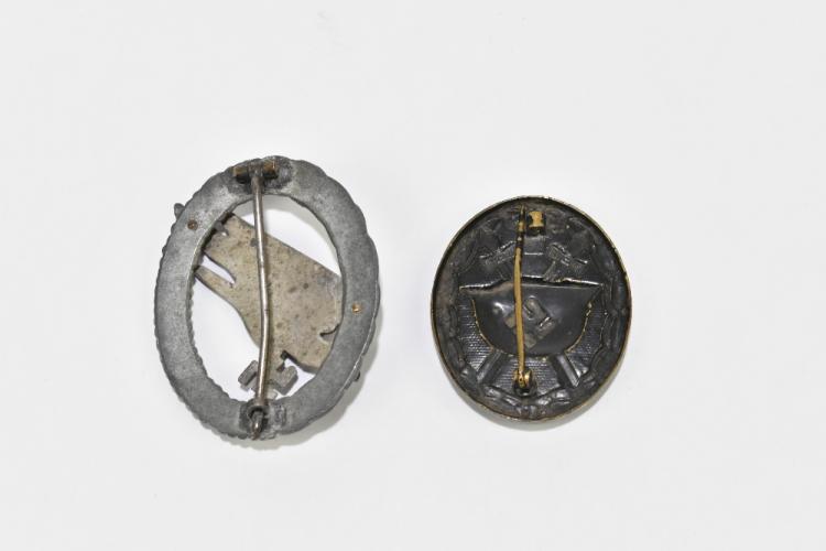 Lot 5 of 1434: A German Third Reich (possibly) Luftwaffe Paratrooper's badge, 5.1 x 4.2cm, and a Third Class Wound badge (2). Footnote: The vendor's father served in the Royal Navy during WWII and purportedly brought these two badges back as war souvenirs.