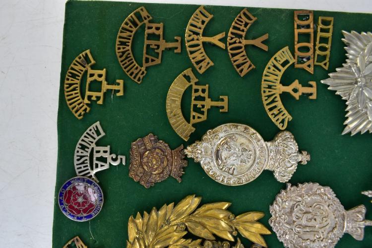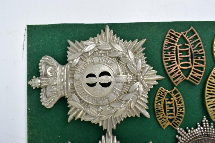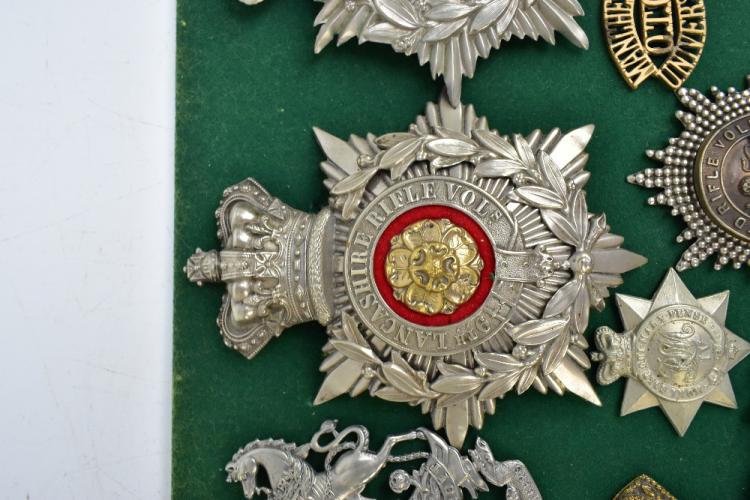 Lot 9 of 1434: LANCASHIRE VOLUNTEERS; a good group of badges including five helmet/shako plates comprising Second, Eighth and Ninth Rifle Volunteers, a further enamelled example and Seventh Lancashire Artillery Volunteers, also a Mounted Rifle Volunteers example, with further cap badges and shoulder titles for Manchester University, Liverpool College, Stonyhurst College, Fourth Lancashire Rifles, Seventh Royal Lancashire Militia, Lancashire Hussars, etc, and a large gilt metal helmet plate featuring three lion