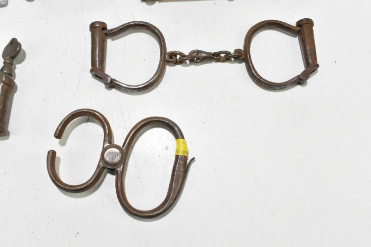 Lot 16 of 1434: Two late 19th/early 20th century pairs of handcuffs, one pair with military issue broad arrow mark and numbered 2771, also a further restraining device stamped 'Hiatt British Made', a group of canvas straps/belts with Police-type badges. Provenance: The Captain Allan Marshall Collection.