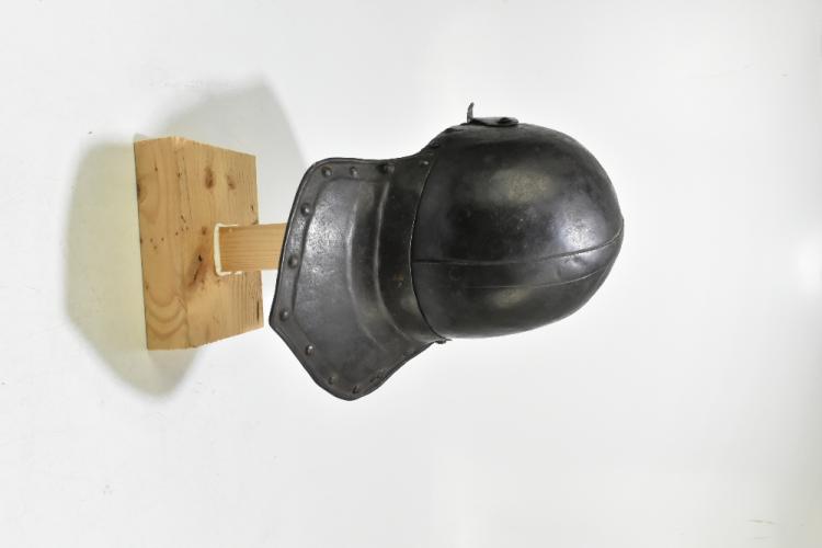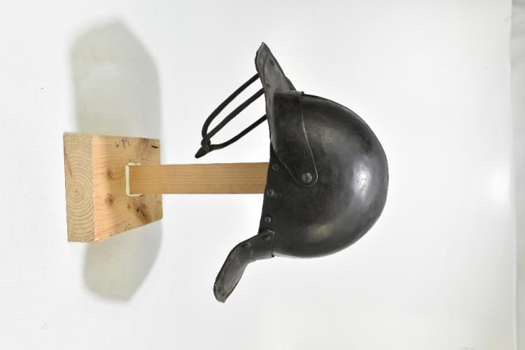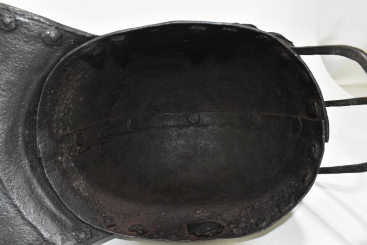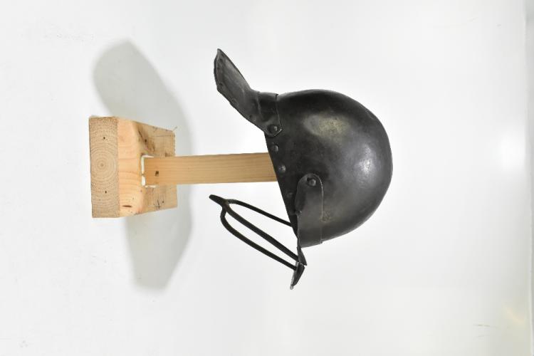 Lot 24 of 1434: An English Cromwellian/Civil War period lobster tail helmet with hinged visor, three bar face guard and fixed neck guard, length approx 40cm. Provenance: The Captain Allan Marshall Collection.