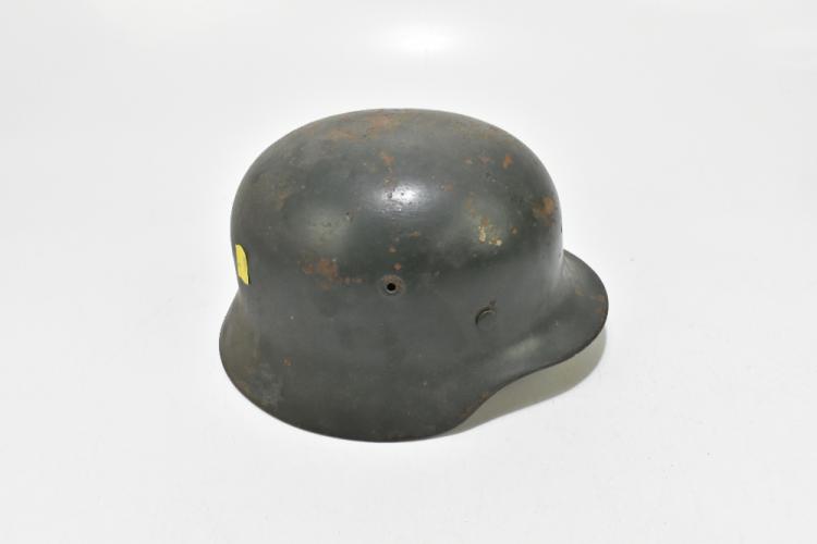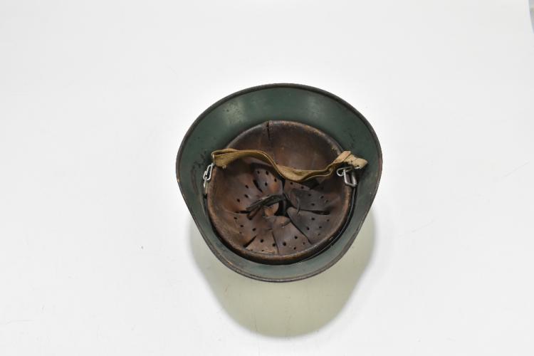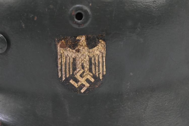 Lot 32 of 1434: A German WWII Wehrmacht helmet bearing eagle and swastika decal, retaining leather liner and canvas chin strap, length 28.8cm. Provenance: The Captain Allan Marshall Collection.