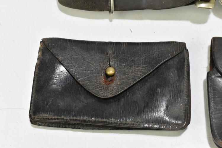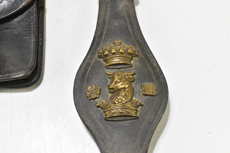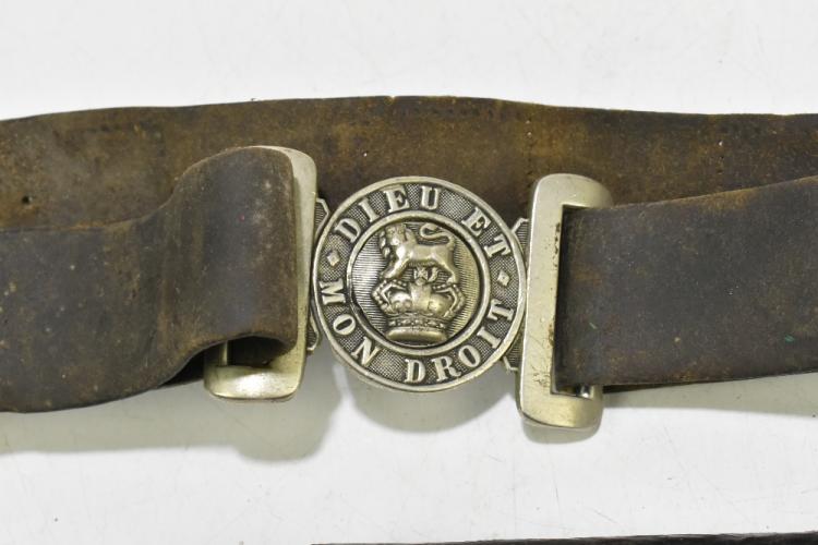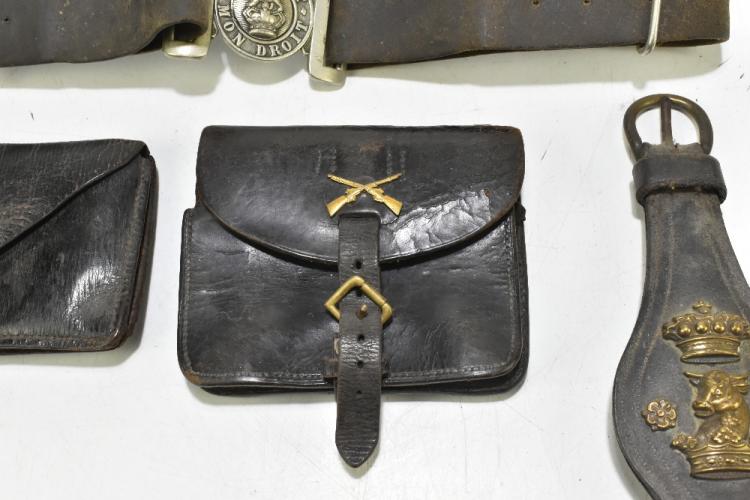 Lot 47 of 1434: Two leather ammunition pouches, one with gilt badge of crossed rifles, a belt with line above crown device and inscribed 'Dieu et Mon Droit', and a further partial leather belt with applied brass ball beneath crown. Provenance: The Captain Allan Marshall Collection.