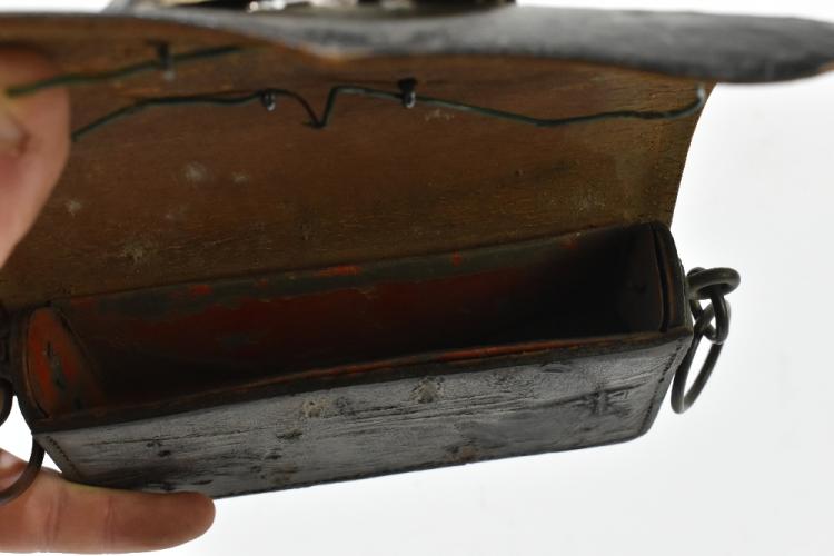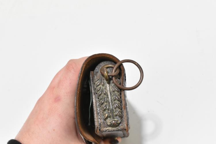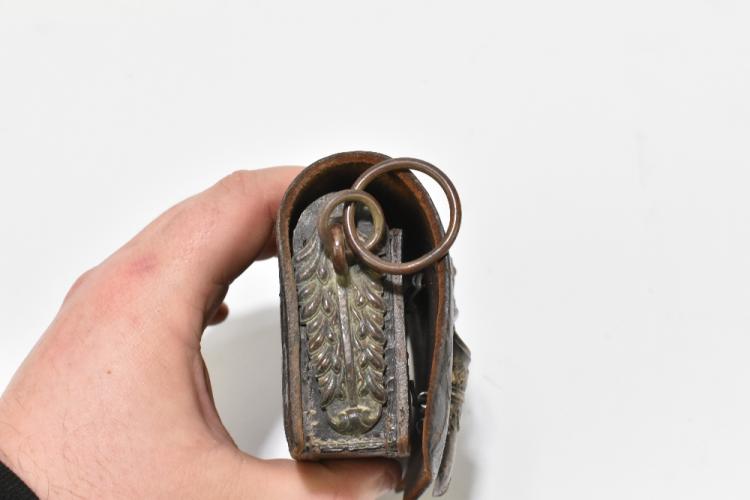 Lot 48 of 1434: A 19th century leather ammunition pouch with applied white metal crown and badge for the 14th Battalion Canadian Volunteer Militia Rifles, with twin loop attachments, width 15.3cm. Provenance: The Captain Allan Marshall Collection.