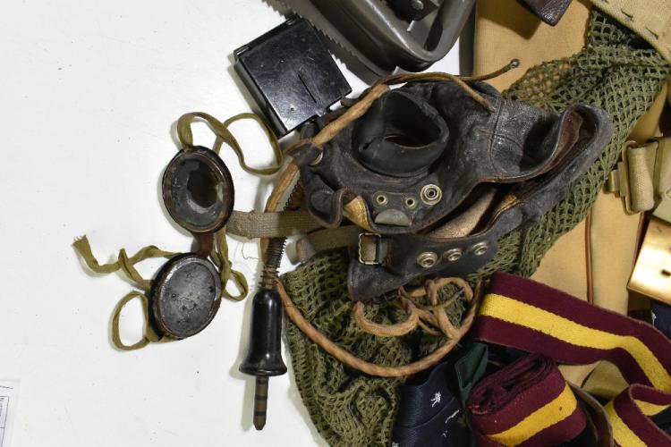 Lot 50 of 1434: A group of military and military-type equipment including canvas bags, holsters, entrenching tool, leather flying cap (named Sinclair but otherwise unmarked), webbing, etc. Provenance: The Captain Allan Marshall Collection.