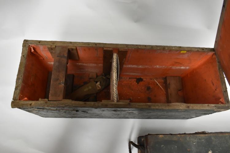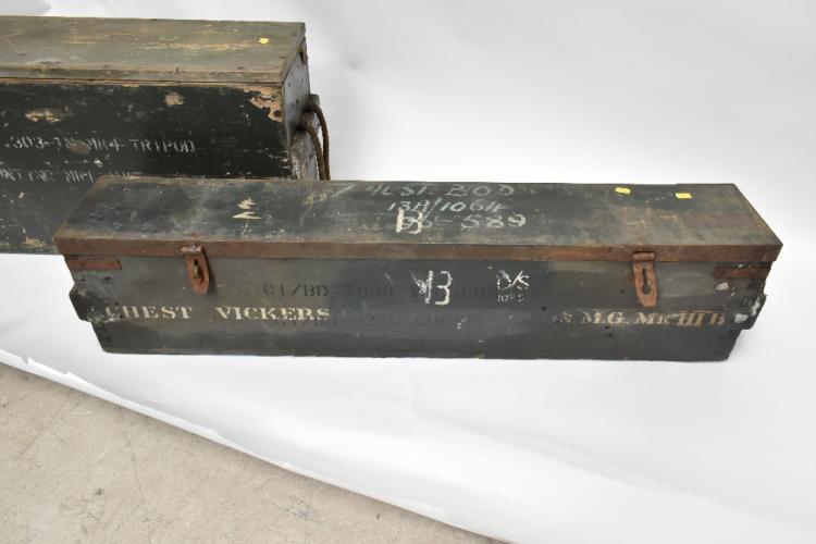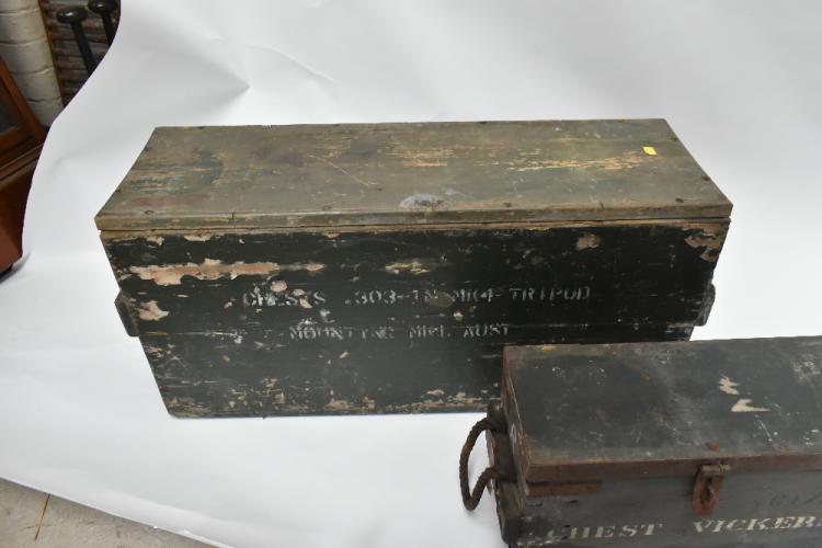 Lot 54 of 1434: Two wooden ammunition boxes for Vicars machine guns, the larger with stenciled label 'chests .303 - in mk4 tripod mounting mk I Aust', this approx 42 x 95 x 29cm, both with rope handles (2). Provenance: The Captain Allan Marshall Collection.
