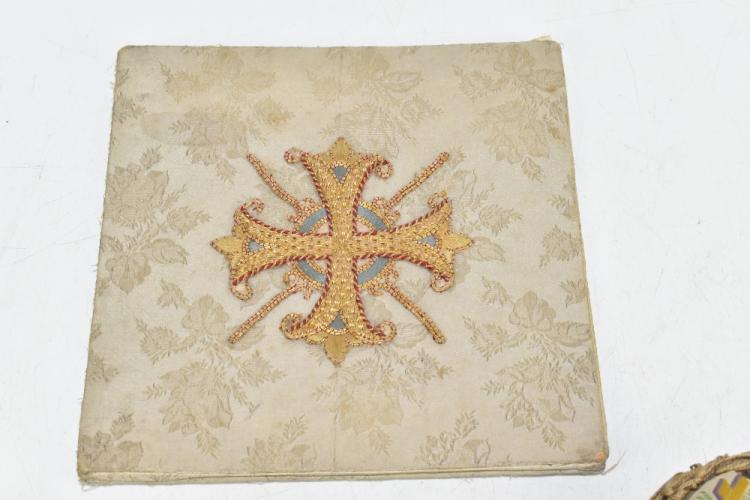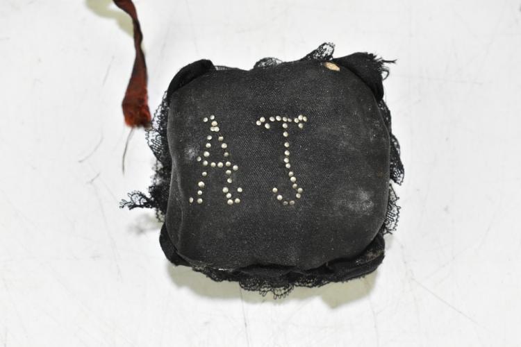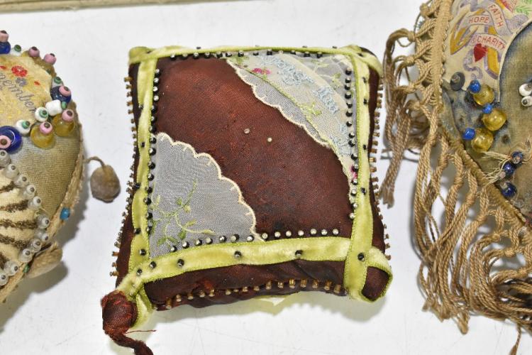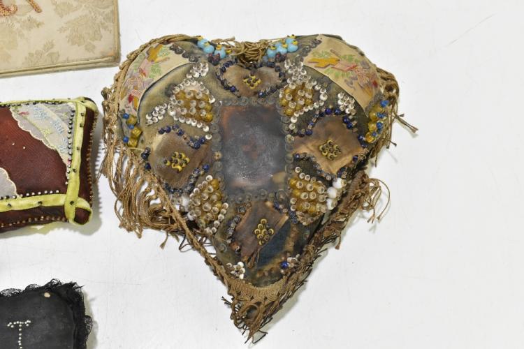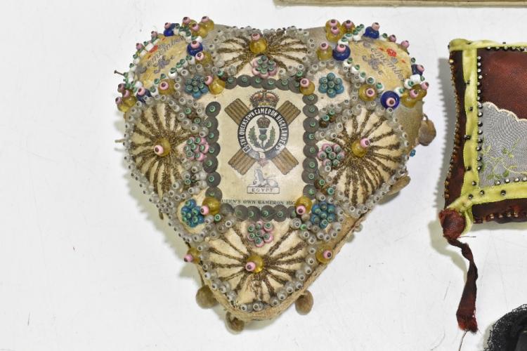 Lot 64 of 1434: Two sweetheart pincushions for the L.N. Lancashire Regiment and the Queen's Own Cameron Highlanders, of typical heart shaped form, also two further pincushions and a further pouch with gilt embroidered cross, width of larger cushion 23cm. Provenance: The Captain Allan Marshall Collection.