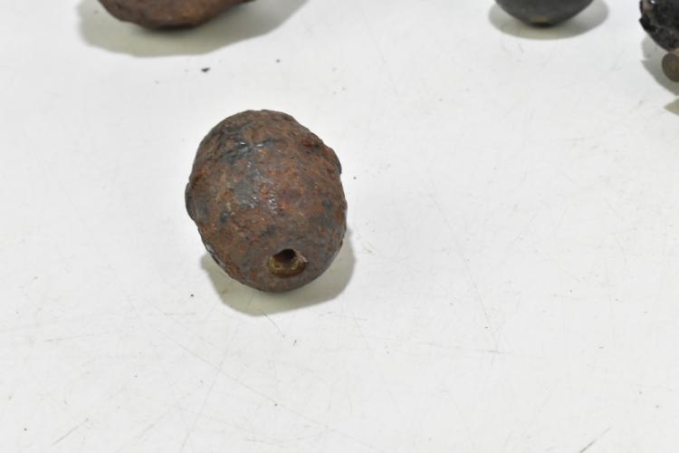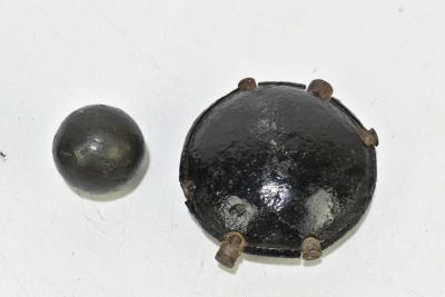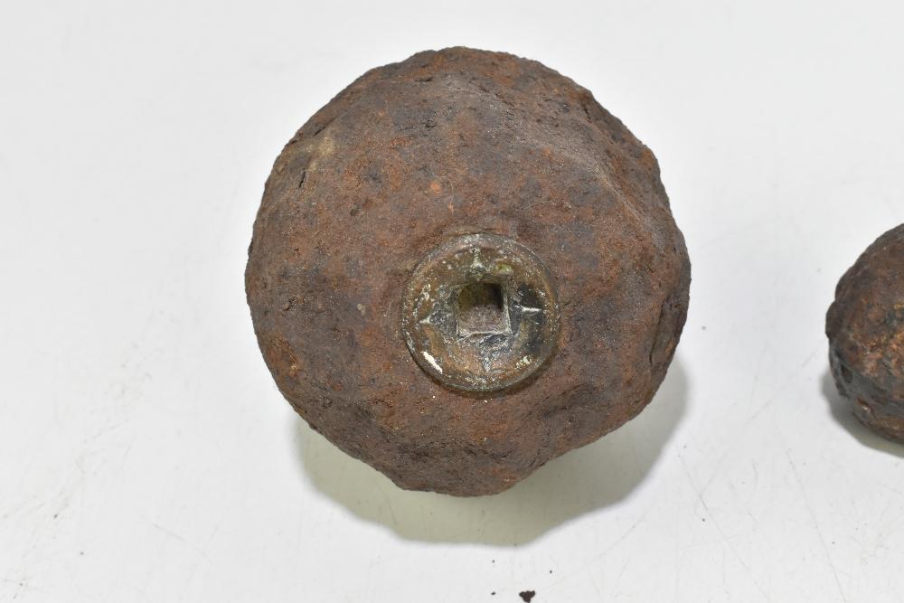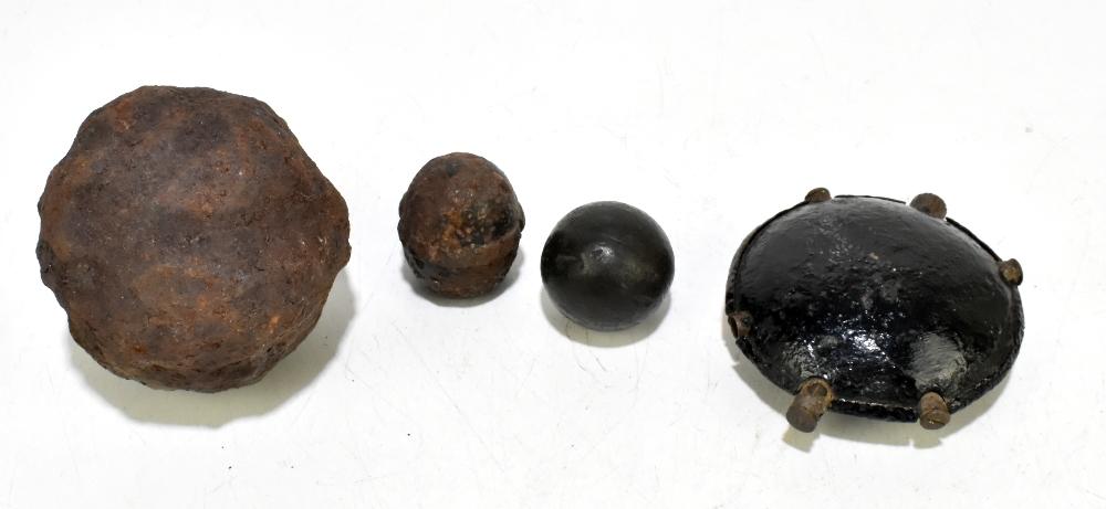 Lot 67 of 1434: A relic explosive cannon ball, diameter approx 10cm, and two further small relic finds (3). Provenance: The Captain Allan Marshall Collection.