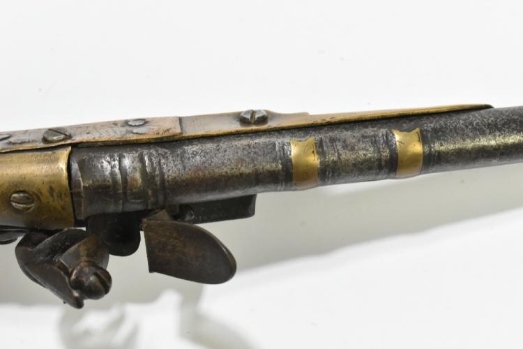 Lot 186 of 1434: A 19th century flintlock pistol with 9.5" cannon barrel with inlaid bands of yellow metal, fitted with an all brass stock, stamped to the back strap '8/5', overall length 37cm. Provenance: The Captain Allan Marshall Collection.