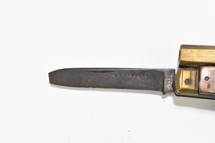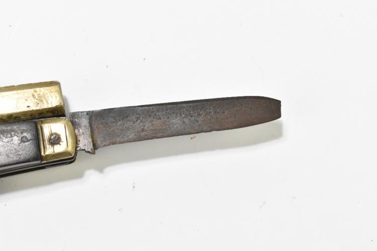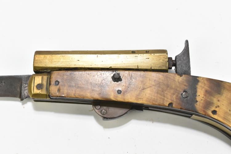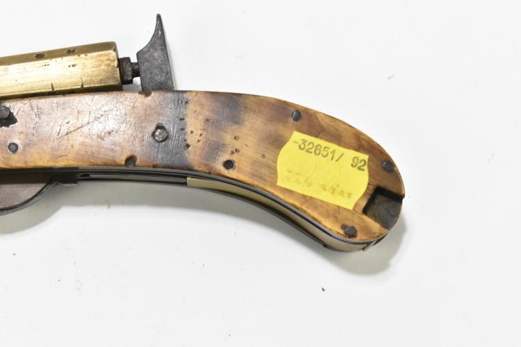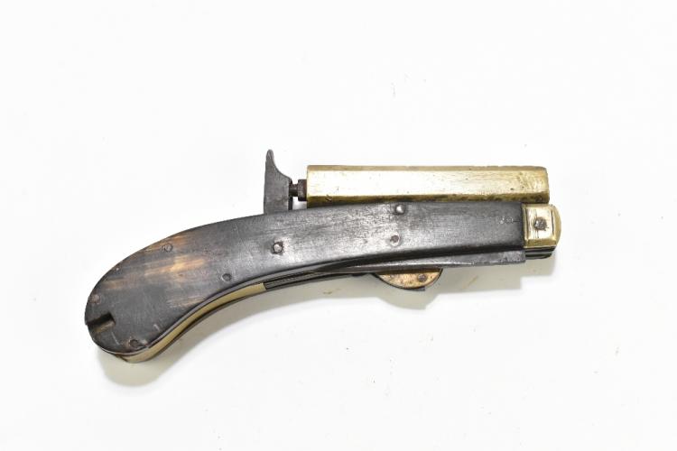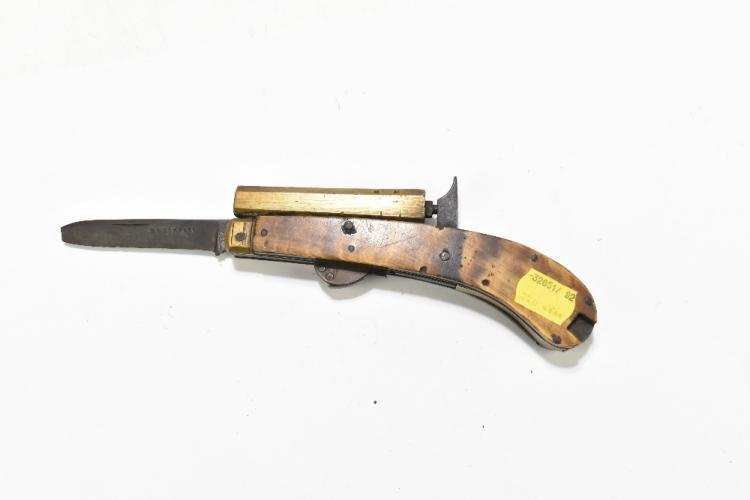 Lot 200 of 1434: H.G. LONG & CO; a 19th century percussion cap pistol with 3.25" brass octagonal barrel mounted on a horn grip with folding trigger, folding pocket knife, extra shot compartment with hinged lid to the pommel, overall length 17cm. Provenance: The Captain Allan Marshall Collection.