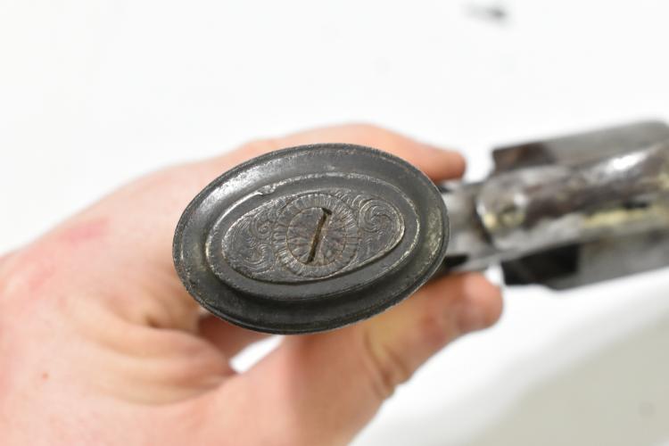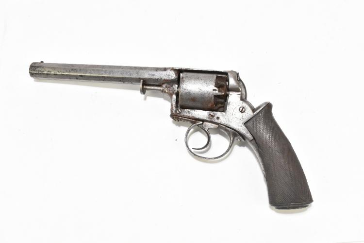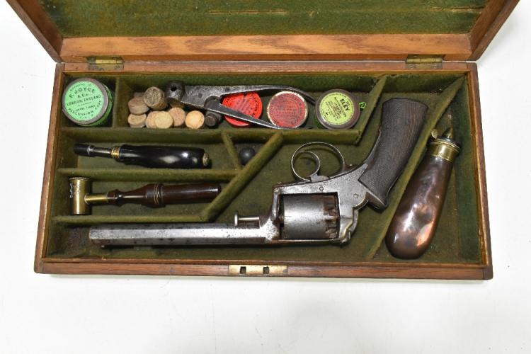 Lot 201 of 1434: A cased 19th century percussion cap five shot revolver with 6.5" octagonal barrel, with simple foliate engraving and checkered walnut grips, in fitted baize lined gun case bearing a label to the lid 'C. Evans Late J. Webb, Salisbury', with various loading accoutrements, length of case 39cm, depth 19cm, height 7cm, inset with a brass vacant cartouche to the lid.  Provenance: The Captain Allan Marshall Collection.