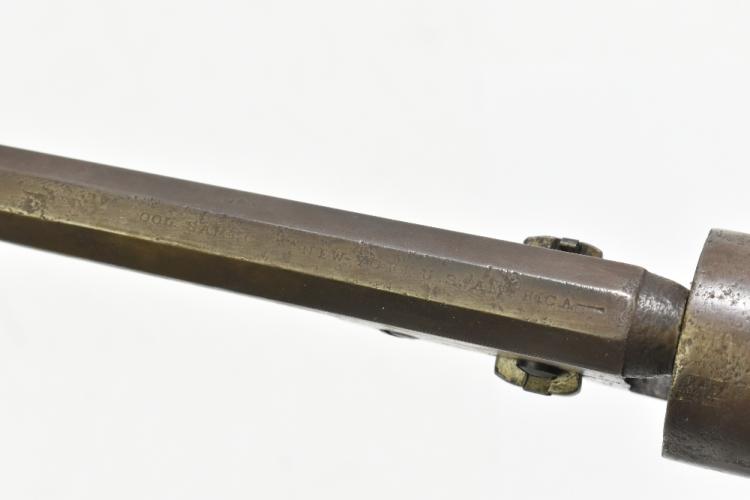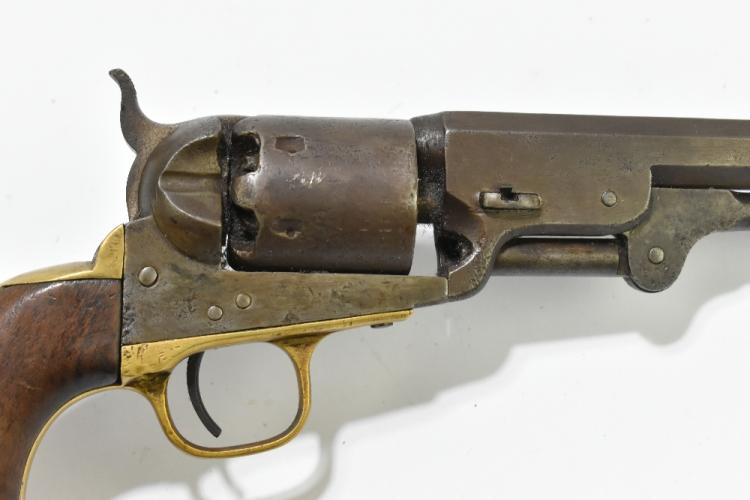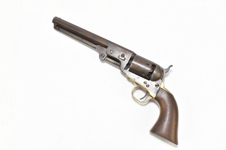Lot 204 of 1434: COLT; a 19th century percussion cap .36 six shot revolver, the 7" octagonal barrel stamped with the maker's details and the New York address, fitted with walnut grips and brass back strap, matching serial numbers throughout, overall length 33cm, SN:183695. Provenance: The Captain Allan Marshall Collection.