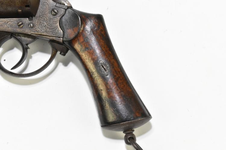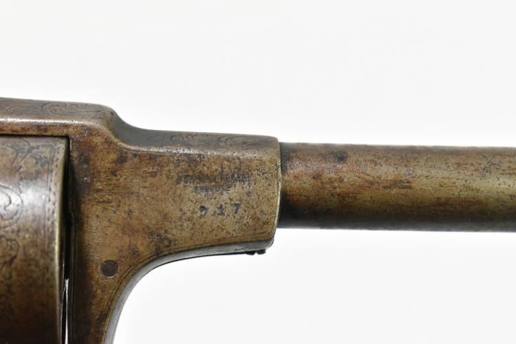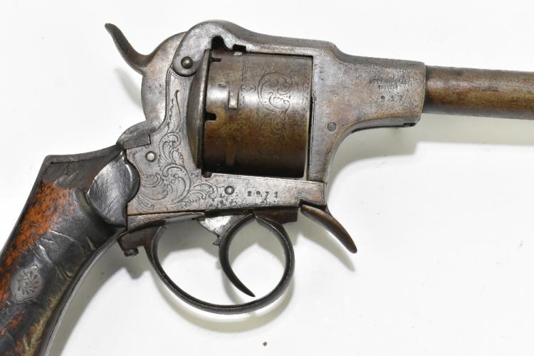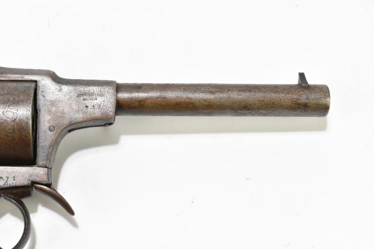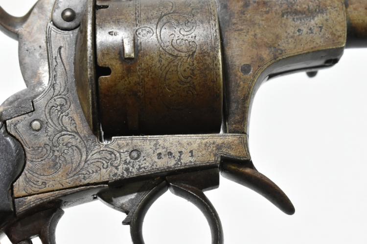 Lot 208 of 1434: A late 19th/early 20th century Belgian pinfire revolver, the frame indistinctly signed with the maker's name above 'Brevete', with matching serial numbers throughout, with simple foliate engraving to the cylinder and frame, overall length 29cm, SN:3971. Provenance: The Captain Allan Marshall Collection.