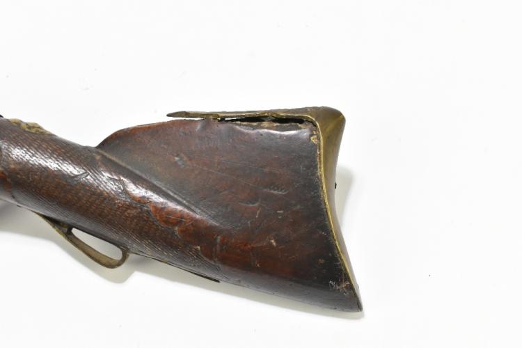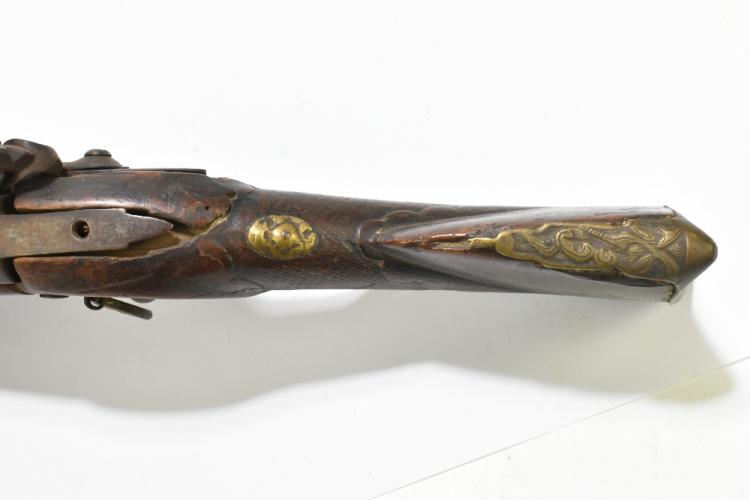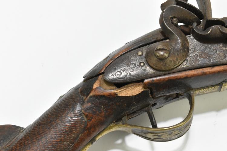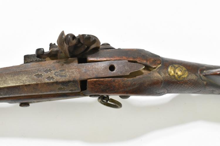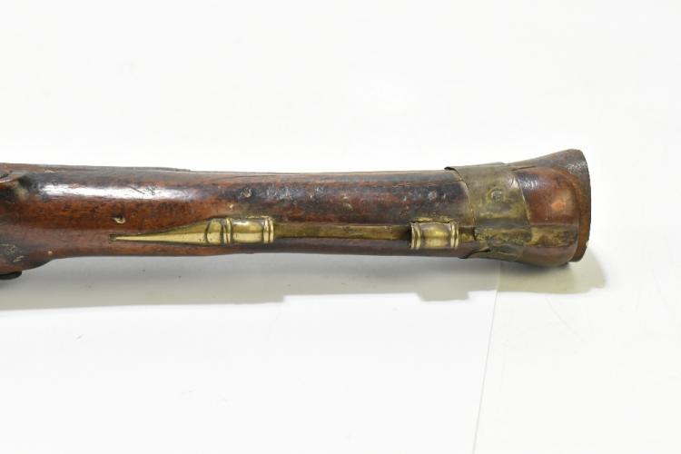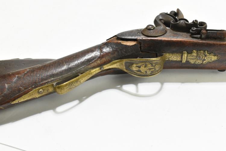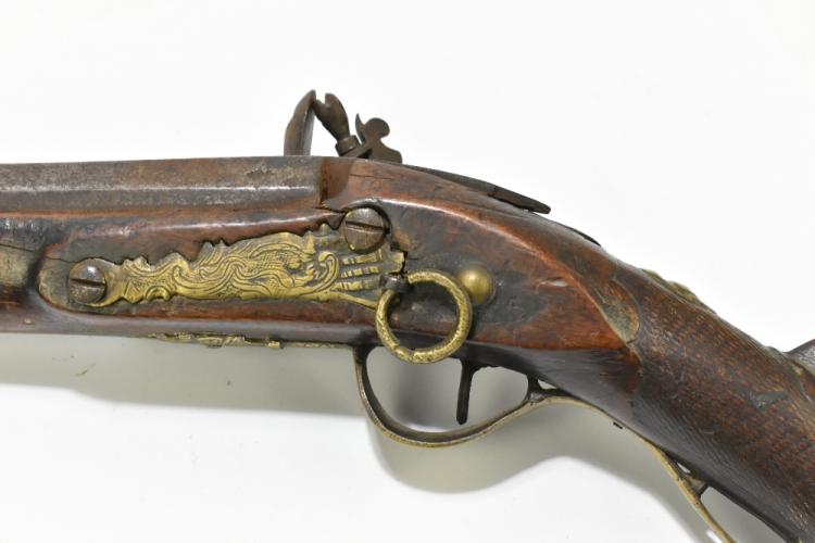 Lot 210 of 1434: An early 19th century flintlock blunderbuss with steel barrel bearing various indistinct proof marks, checkered walnut stock and brass furniture, length 53cm. Provenance: The Captain Allan Marshall Collection.