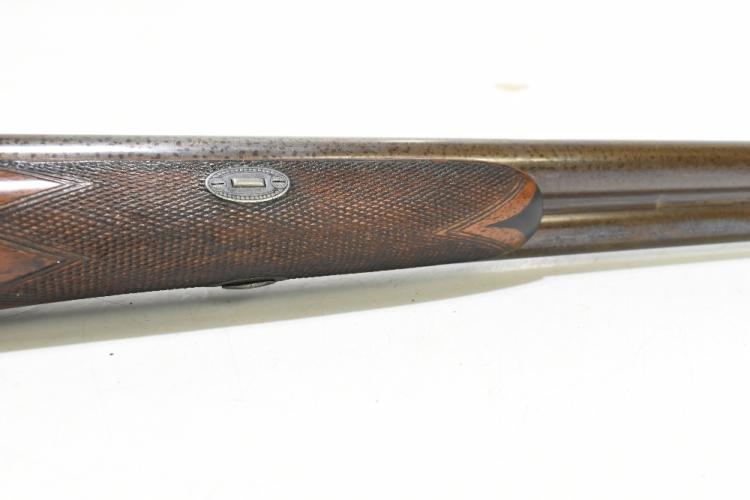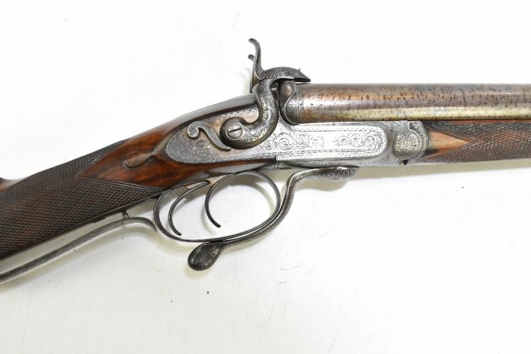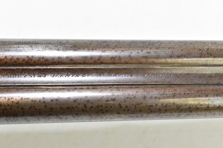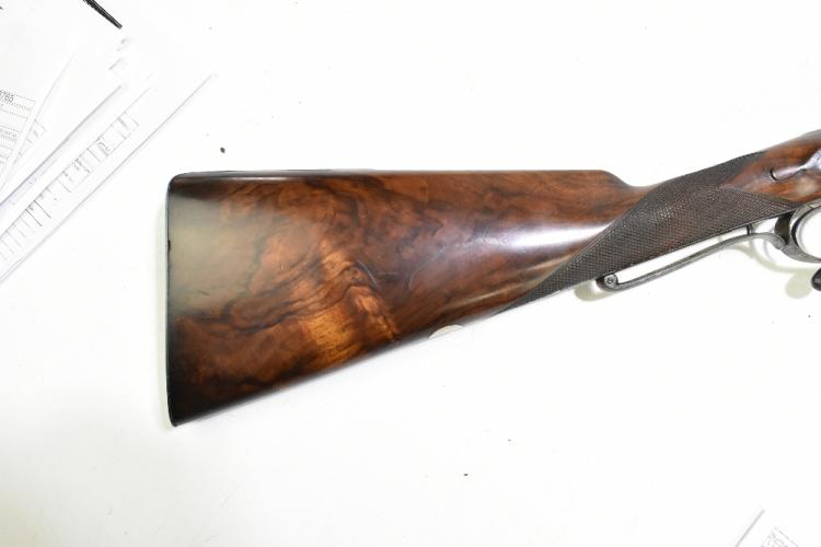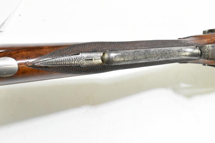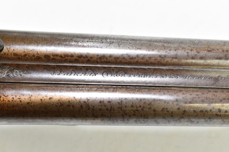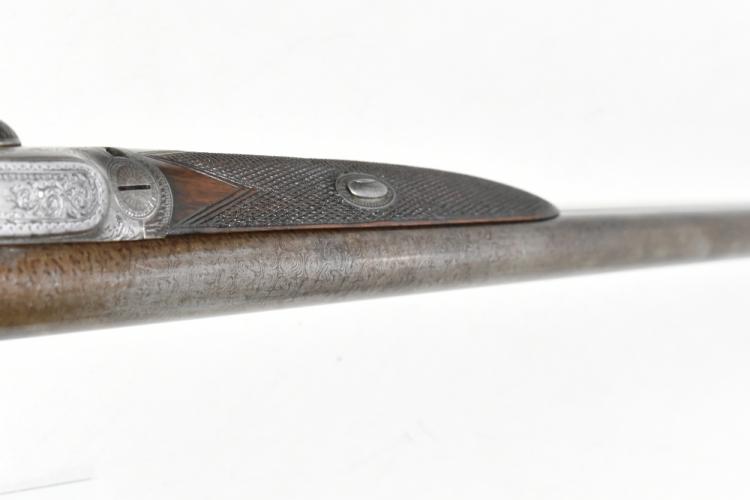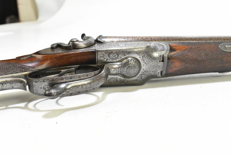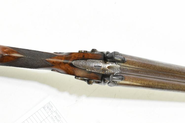 Lot 220 of 1434: J. FAIRMAN (FROM PURDEY'S); a 12 bore side-by-side underlever pinfire hammer gun, the 28" Damascus barrels fitted with 2.5" chambers and smooth concave rib bearing the maker's names and address '23 Jermyn Street, St James's, London' and further stamped 'No.1' to the barrel, the lock plate engraved with tight foliate scrolls within a scrolling border and mounted with a patented safety lever to both sides of the action, mounted with a checkered well-figured walnut stock with inlaid white metal pon