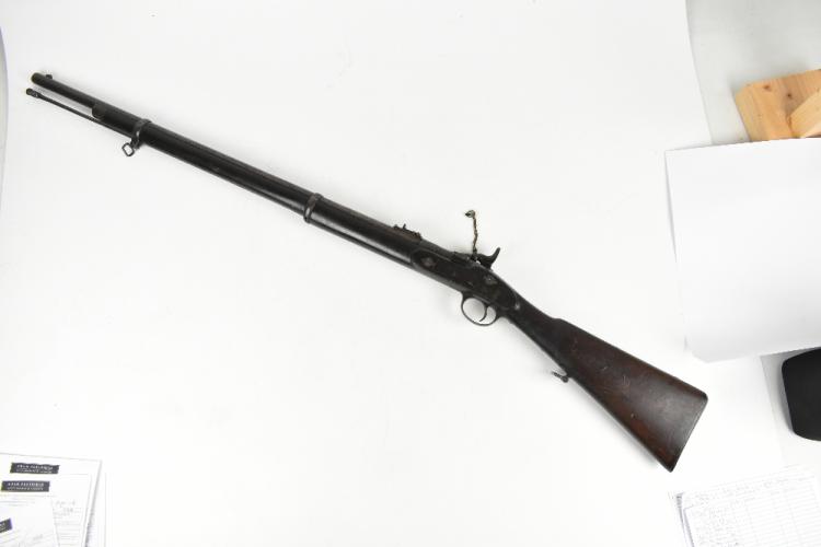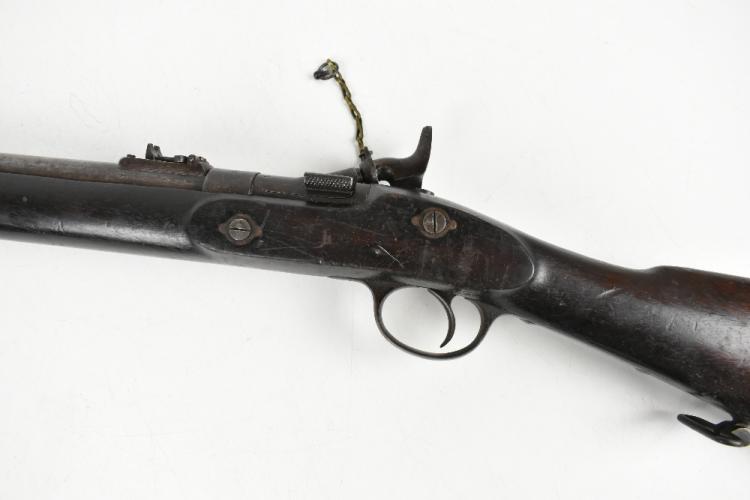 Lot 224 of 1434: A 19th century Snider-Enfield .577 breech loaded rifle fitted with a 30" barrel and steel furniture, bearing various broad arrow and War Department stamps to the barrel and action, overall length 123cm. Provenance: The Captain Allan Marshall Collection.