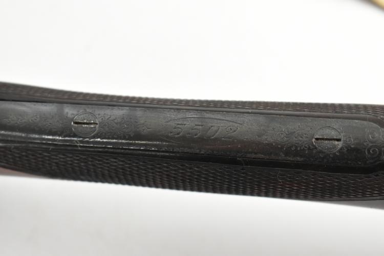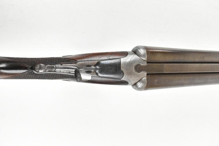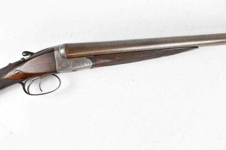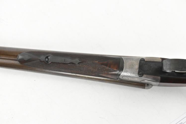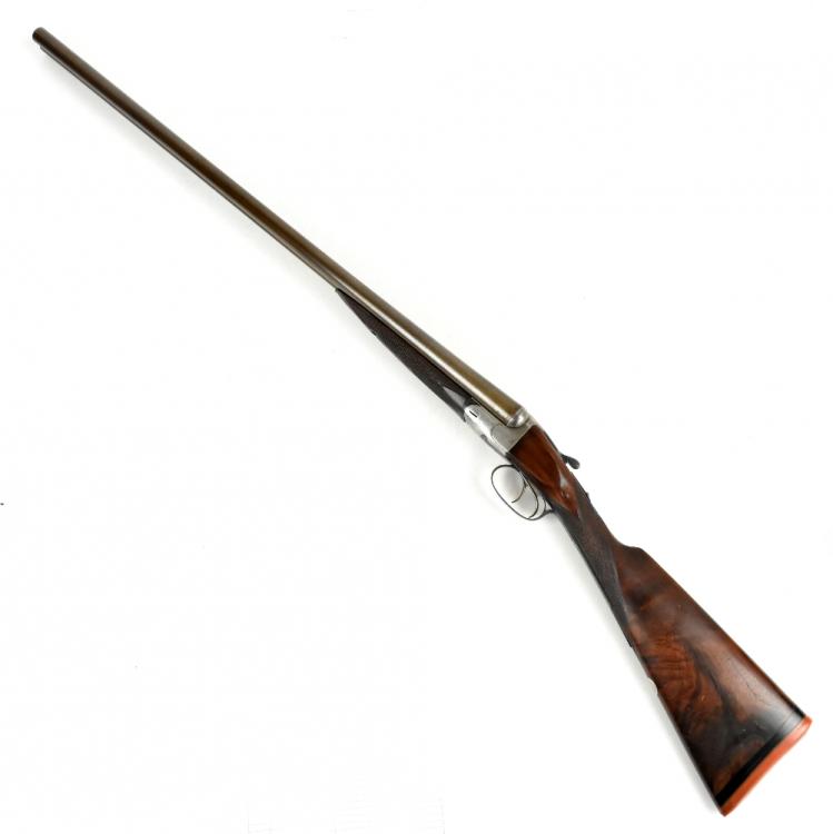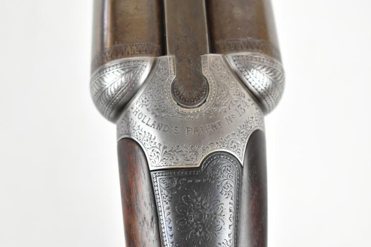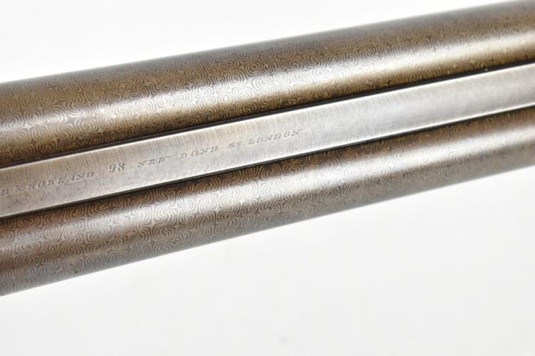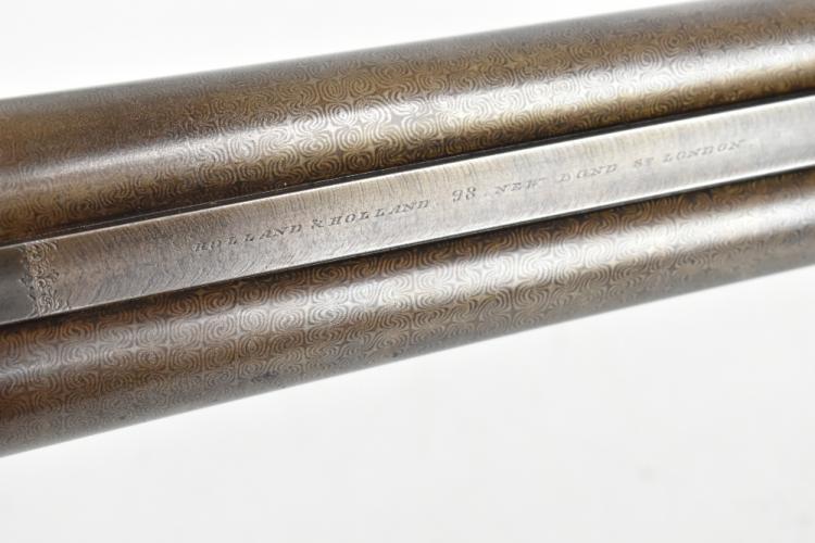 Lot 277 of 1434: HOLLAND & HOLLAND; a Hollands Patent No.134 12 bore side-by-side double trigger boxlock non-ejector shotgun, the 30" Damascus barrels with 2" chambers and fitted with a smooth concave rib bearing the maker's name and address '98 New Bond Street, London', the action with foliate scrolls and further floral scrolling borders, the blued trigger guard with further engraving and mounted on a checkered walnut stock inlaid with a white metal poncoin and set with an ebonite spacer and rubberised shoulder